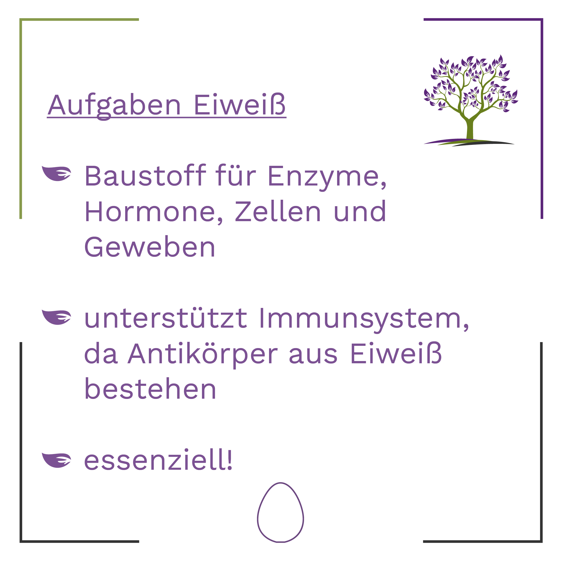 Eiweiß und Fette sind Baustoffe für unsere Enzyme, Hormone, Zellen und für unser Gewebe. Sie unterstützen unser Immunsystem, die Aufnahme von Mikronährstoffen und sorgen für eine bessere Energieversorgung.